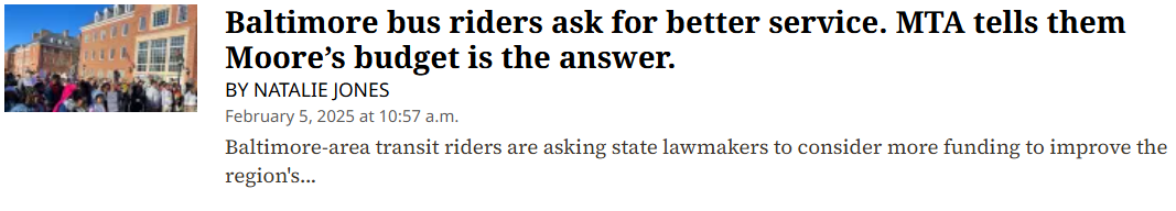 Maryland needs to take major and quantifiable steps to improve reliability, frequency, and accountability for Baltimore transit riders including funding MTA's Bmore Bus plan which would transform bus service throughout the Baltimore region.